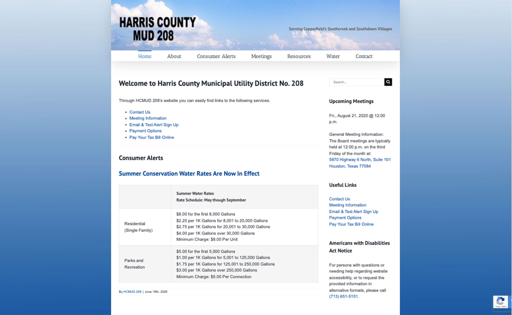 Harris County MUD 208 recently contracted with Infinity Services for their District website. The District has is determined to keep residents informed on what’s going on in the District through the use of Consumer Alerts and Latest News posts, along with Email and Text Alerts. The website liason has been instrumental in ensuring we received the most up-to-date information in a timely manner.