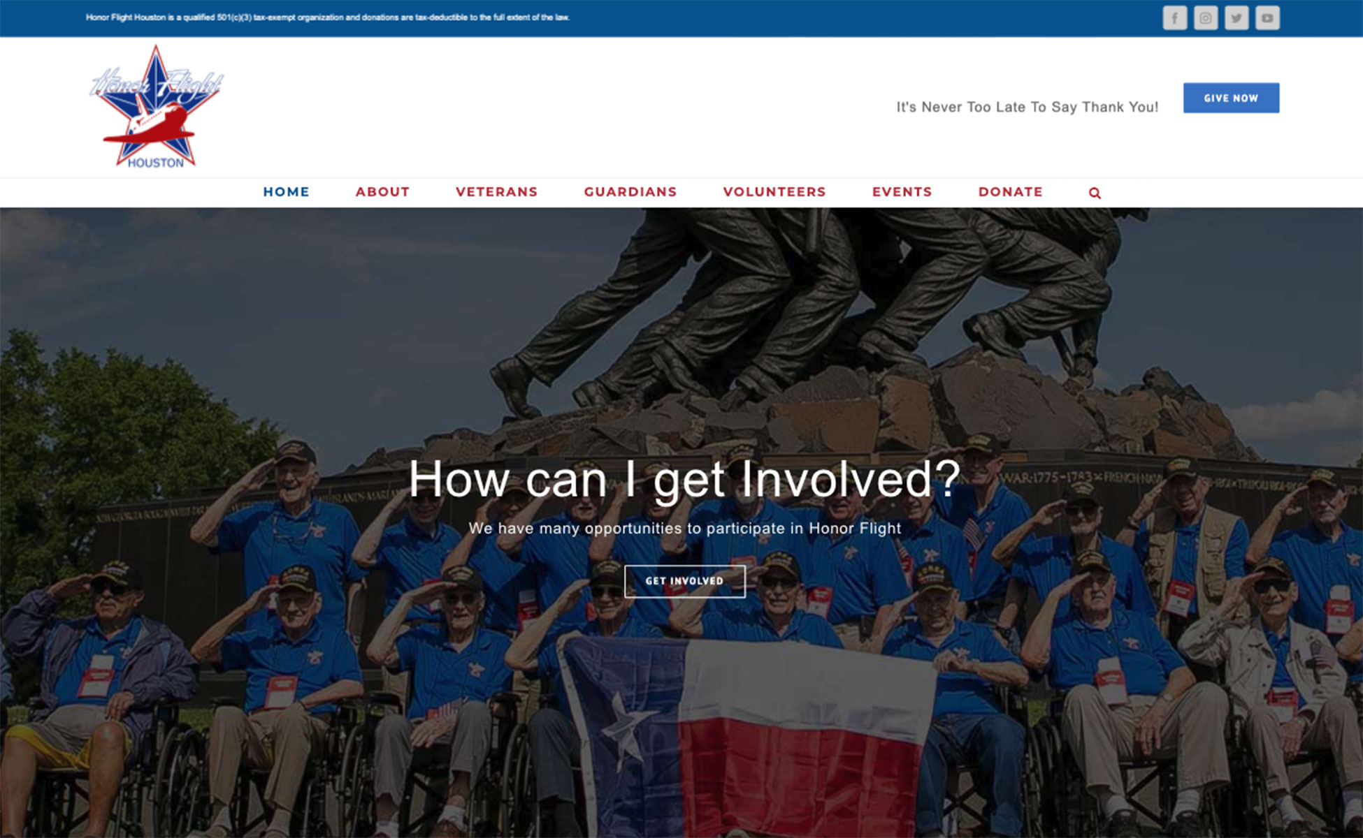 Honor Flight Houston started the website process to increase involvement in their program. Their goal is to help every veteran in America to visit their memorial. Honor Flight utilize the website to convey their message and gather support for the an experience for veterans. Through their various pages people can donate, volunteer and learn about the veterans that have been given and opportunity to see their war memorial.